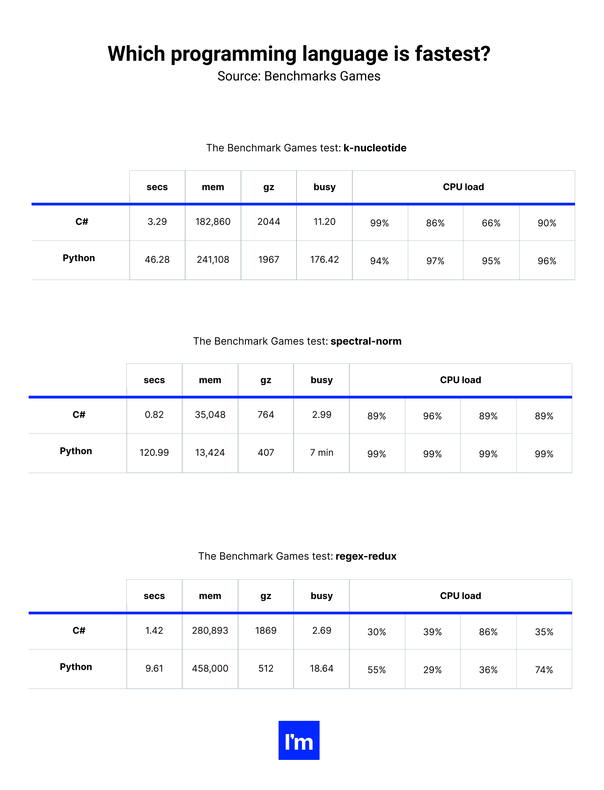 Talking about performance, C# overcomes Python with a great advantage. To prove that C# runs programs faster with less memory usage, let’s look at data about bench-mark program execution.