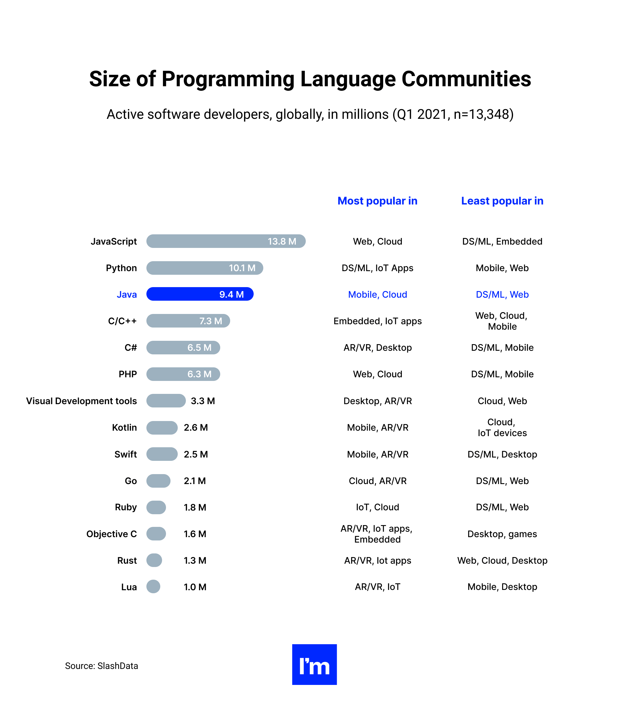 Why: Java is making inroads into data science, big data, and machine learning projects. This is because it provides not only a secure but also a highly portable platform. Other features of Java that make it advantageous for developing AI, ML, and data science software include cross-platform support, built-in performance optimizations (like the garbage collector), fast debugging, and scalability.